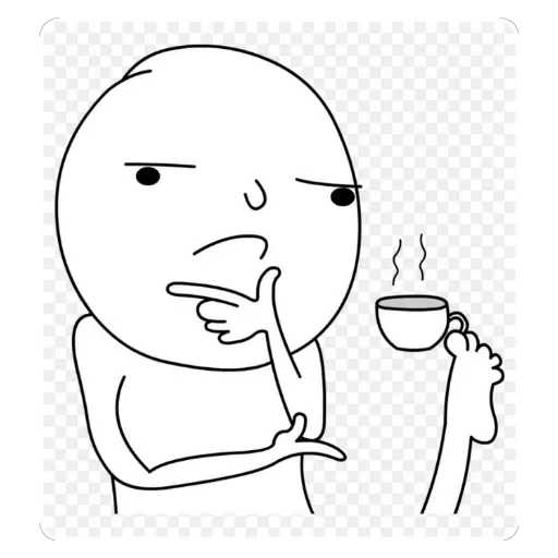 Um personagem de desenho animado com uma expressão pensativa e cética, apontando o dedo indicador para o queixo enquanto segura uma xícara de café com a outra mão.