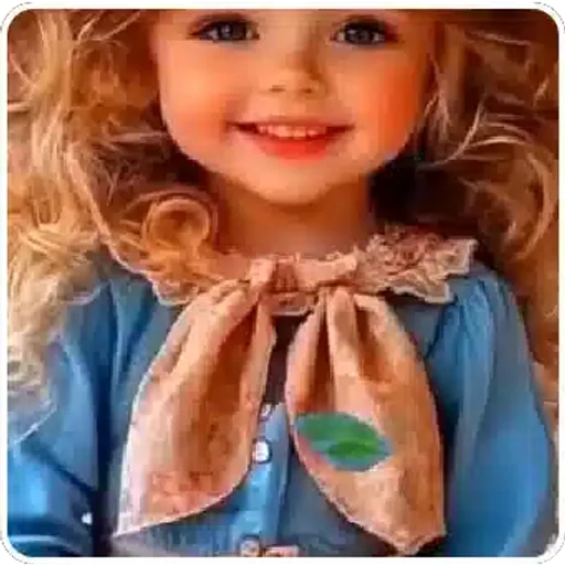 Rosto de uma menina loira com um vestido azul e uma gola rosa com um pequeno sticker verde no centro.