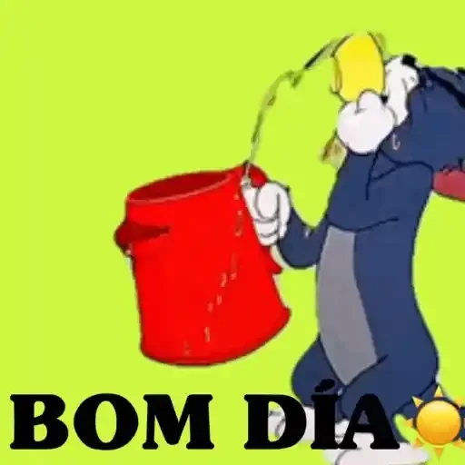 Tom, do desenho Tom e Jerry, vestindo um capacete amarelo, segura um balde vermelho com água pingando, em um fundo verde limão. Abaixo dele, está escrito 'BOM DIA' em letras pretas.