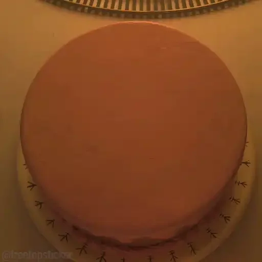 Um bolo de chocolate com cobertura rosa, em cima de uma base redonda com decorações.