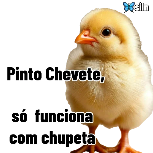 Um filhote de galinha amarelo com pernas laranjas e um bico laranja, com o texto 'Pinto Chevete, só funciona com chupeta' sobreposto.