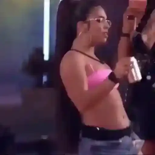 Um homem com óculos e cabelo preto, sem camisa, mostrando o tórax, com uma faixa rosa no seio esquerdo, segurando um objeto branco na mão direita.