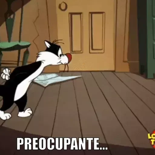 Gato preto e branco olhando para um papel no chão com a expressão 'PREOCUPANTE...'