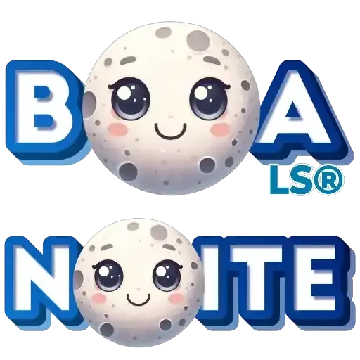 Uma lua com rosto sorridente e bochechas rosadas, com as palavras 'BOA NOITE' em letras grandes ao redor.
