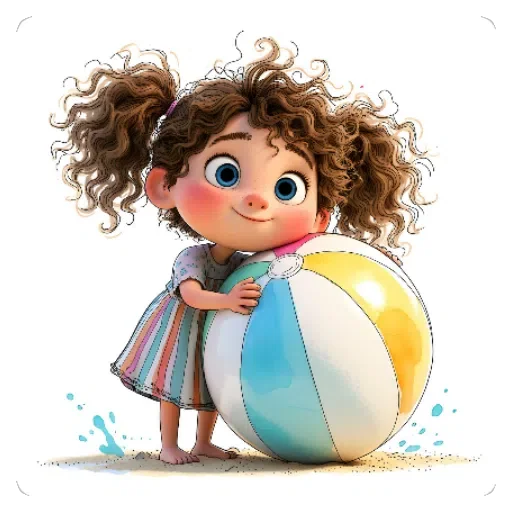 Menina com cabelos castanhos encaracolados e olhos azuis grandes, abraçando uma bola de praia colorida. Ela está usando um vestido listrado.