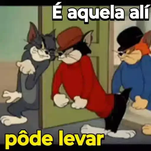 Tom e Jerry estão em uma porta, com o Tom de vermelho apontando para outro Tom, com texto "É aquela ali, pode levar"