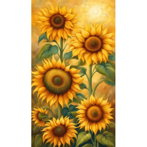 Um buquê de girassóis amarelos com folhas verdes contra um fundo laranja e sol brilhante.