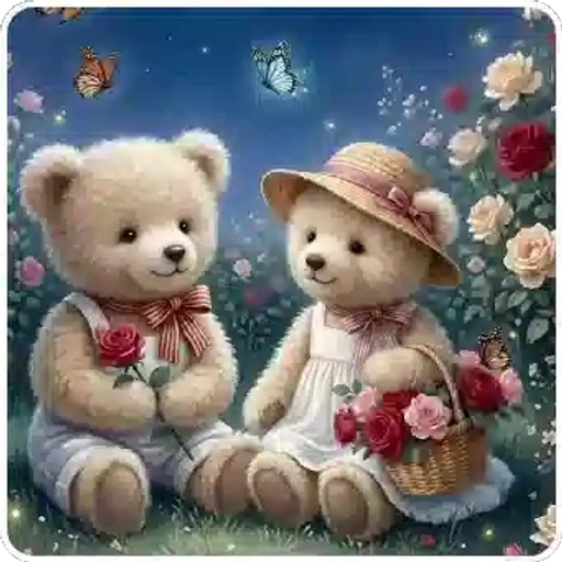 Dois ursinhos de pelúcia sentados em um campo de flores, um com uma rosa na mão e o outro com um cesto de rosas. O cenário noturno inclui borboletas e estrelas.
