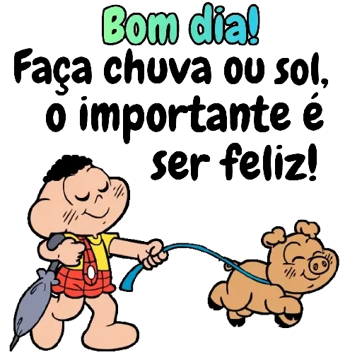 Um menino de cabelos pretos e um cachorro castanho estão lado a lado. O menino veste uma camisa amarela e calça vermelha. Ele sorri e segura uma coleira azul que o cachorro puxa. O texto 'Bom dia! Faça chuva ou sol, o importante é ser feliz!' aparece acima deles.