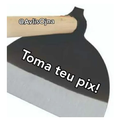 Uma imagem de uma espátula com uma inscrição 'Toma teu pix!' e uma marca '@AvlisOjuu' no cabo. A espátula tem uma parte preta e cinza.
