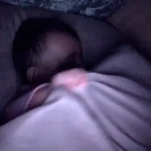 Um bebê dormindo deitado de lado em uma cama, com um cobertor roxo sobre o corpo.