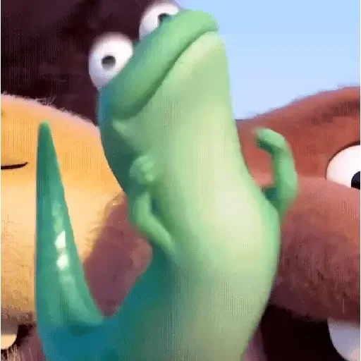 Um lagarto verde com olhos grandes e expressão surpresa, ao lado de outros personagens de pelúcia.