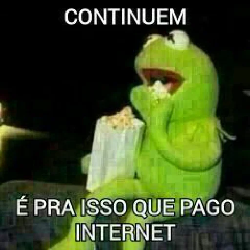 Kermit, o sapo do Muppet, comendo pipoca enquanto assiste algo na tela, com as frases 'CONTINUEM', 'É PRA ISSO QUE PAGO INTERNET' sobrepostas.