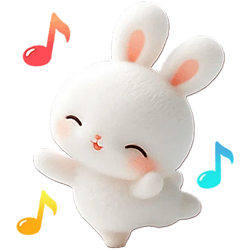 Um coelho branco fofinho com orelhas de coelho e olhos fechados, com notas musicais coloridas ao redor.