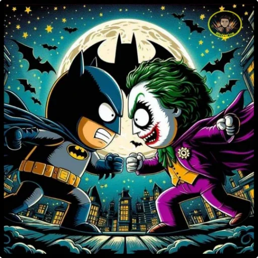 Batman e o Coringa enfrentando-se em frente à lua cheia, com morcegos voando ao fundo e uma cidade ao longe. O Coringa tem uma expressão de loucura e Batman parece determinado.