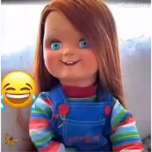 Boneca Chuckie com um sorriso e um emoji de riso ao lado, vestindo macacão azul e camisa listrada colorida.