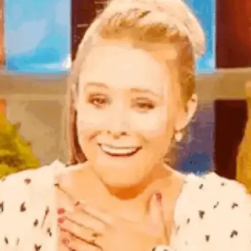 Mulher loira com expressão surpresa ou feliz, mão no peito, fundo desfocado com cores quentes.