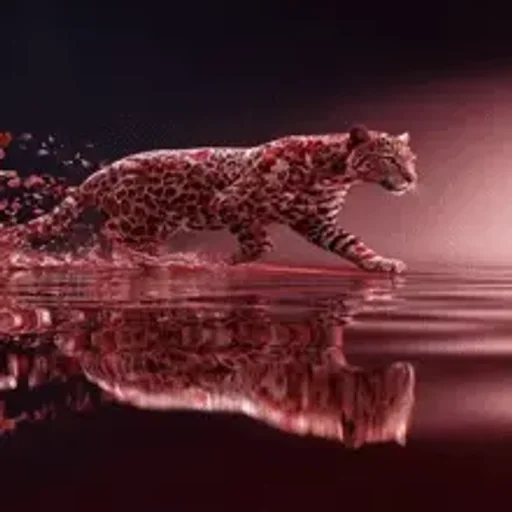 Um leopardo ou tigre com manchas vermelhas e pretas, feito de pequenos pedaços de coral ou pérolas, está em uma pose de ataque, com reflexo na água. O fundo é escuro com luz rosa.