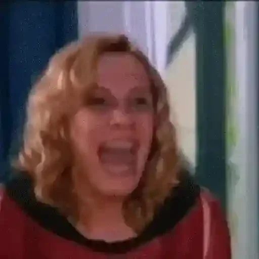 Mulher loira com expressão de surpresa ou choque, vestindo uma blusa vermelha com gola preta.