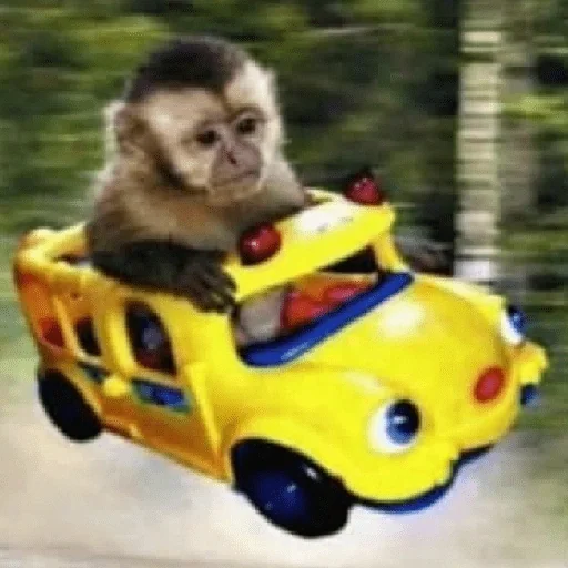 Macaco em um carro amarelo de brinquedo com expressão séria, dirigindo em um cenário verde desfocado.