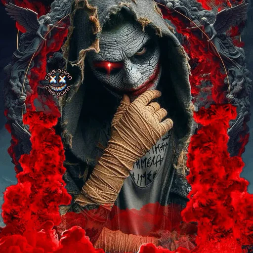 Um personagem sombrio com olhos vermelhos e uma bandagem na mão, em meio a chamas vermelhas e um fundo escuro com detalhes em cinza.