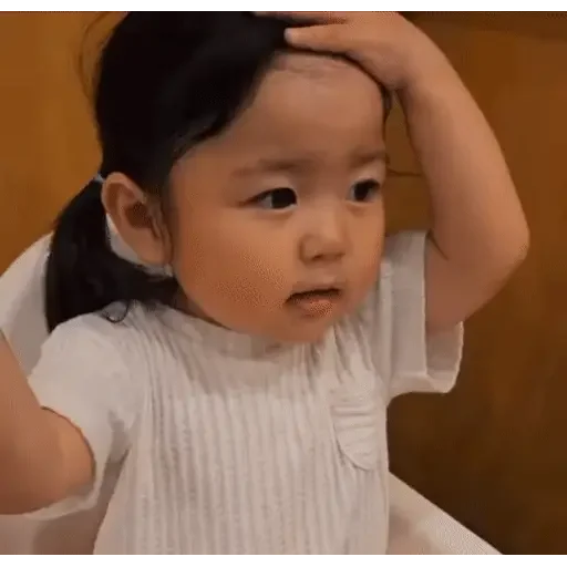 Menina asiática com cabelo preto em um coque, vestindo uma blusa branca, com a mão no cabelo e expressão de surpresa ou preocupação.