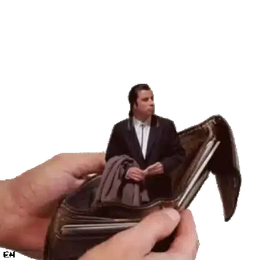 Um homem de terno preto e gravata branca saindo de uma carteira preta, segurada por uma mão.