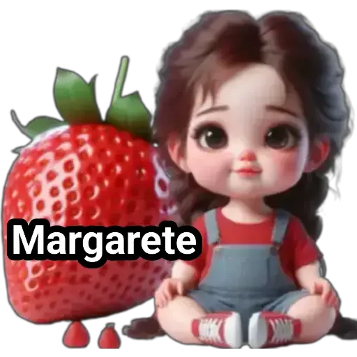 Menina de olhos castanhos e cabelo castanho sentada ao lado de uma morango gigante, com o nome 'Margarete' sobreposto. Ela veste macacão azul e uma blusa vermelha.