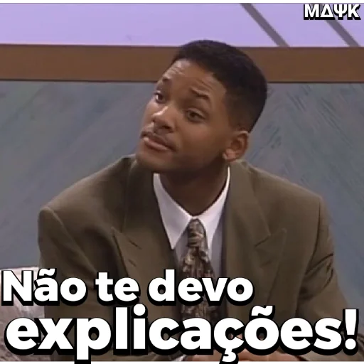 Homem de terno olhando para o lado com expressão séria e texto 'Não te devo explicações!' em destaque.