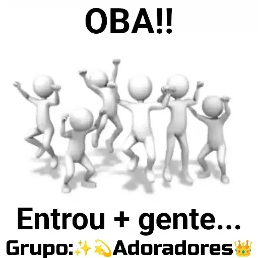 Sete bonecos cinza dançando com os braços levantados, com o texto 'OBA!!' na parte superior e 'Entrou + gente... Grupo: Adoradores' na parte inferior.