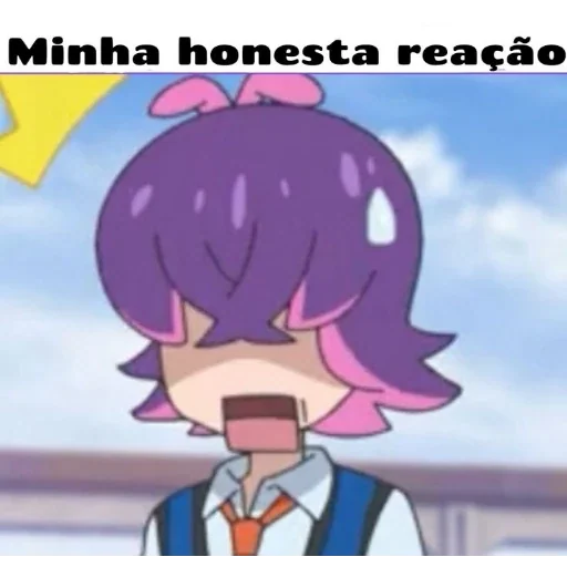 Garota de anime com cabelo roxo e rosa, olhos fechados e boca aberta, expressando surpresa ou choque. O texto 'Minha honesta reação' aparece acima dela.