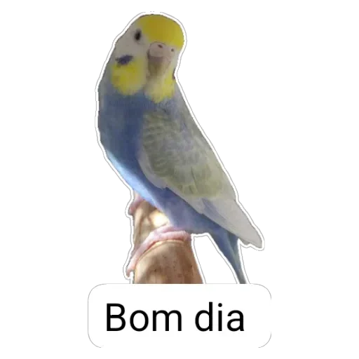 Um periquito azul e amarelo em um galho, com a frase 'Bom dia' abaixo.