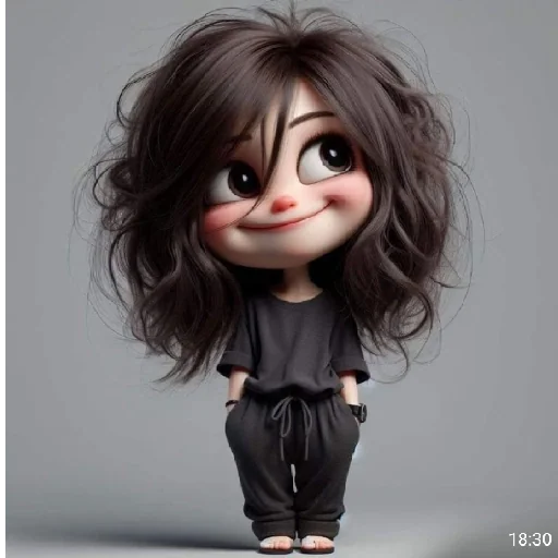 Menina de cabelo castanho encaracolado e olhos grandes, vestida com roupas pretas, com um sorriso tímido no rosto.