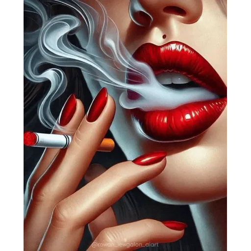 Rosto de mulher com maquiagem, lábios vermelhos e unha pintada, fumando cigarro com uma mão.