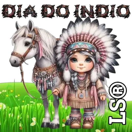 Uma menina indígena com um chapéu de penas coloridas e um colar, vestindo uma roupa tradicional, ao lado de um cavalo branco em um campo verde. A imagem traz o texto 'DIA DO INDIO' em cima.