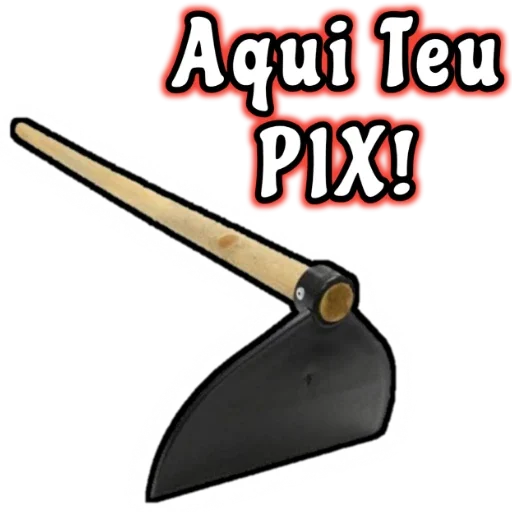 Uma pá com cabo de madeira e lâmina preta, com o texto 'Transferência Pix realizada com sucesso!' em preto, embaixo de…