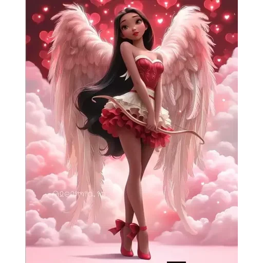 Uma mulher com asas de anjo rosa e cabelo preto longo, vestindo um biquíni rosa e salto alto, segura um arco e flecha em um cenário de nuvens e estrelas.