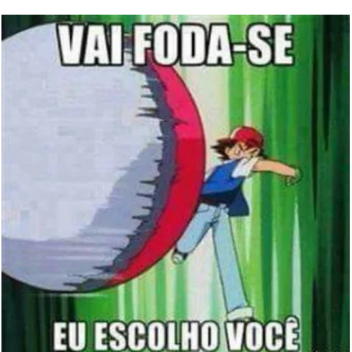 Um personagem de anime, provavelmente Ash Ketchum de Pokémon, com um olhar determinado, está prestes a arremessar uma enorme serra circular. O texto 'VAI FODA-SE EU ESCOLHO VOCÊ' está escrito em letras grandes e ousadas.