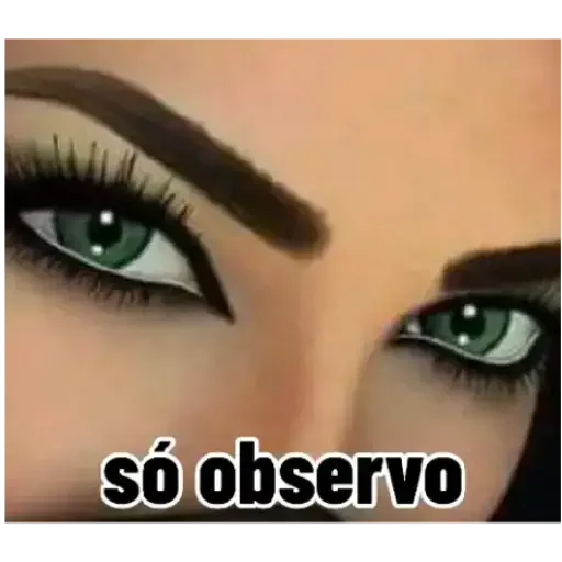 Olhos verdes de uma mulher com sombra e rímel, expressão neutra. Legenda 'só observo'.