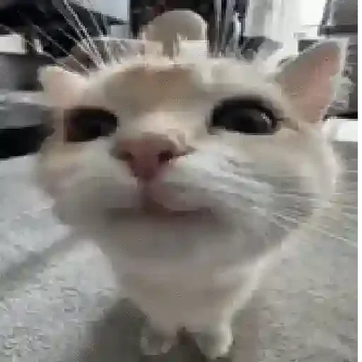 Gato branco com olhos grandes e focados, bigodes longos e um focinho rosa, em uma superfície cinza.