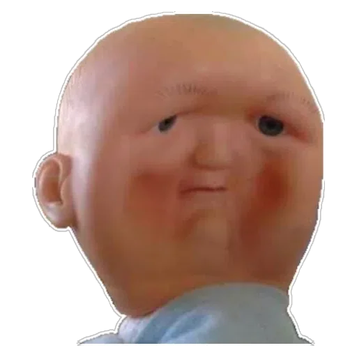Rosto de bebê careca com expressão de desconfiança ou surpresa, cor rosada e olhos pretos.