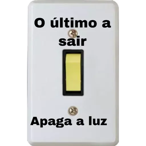Uma placa de interruptor de luz com texto 'O último a sair Apaga a luz'.