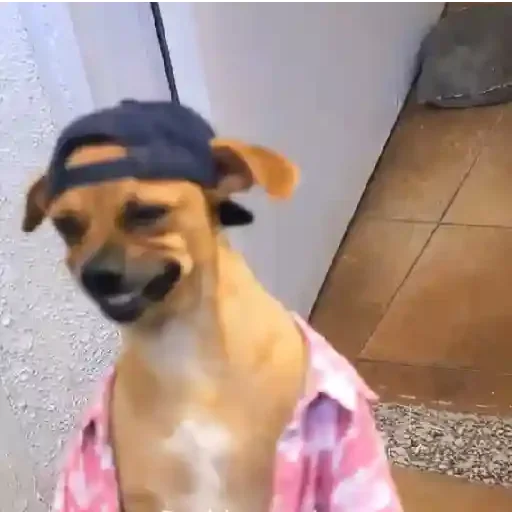Cachorro com um boné preto virado para trás e uma camisa rosa xadrez, parecendo relaxado e feliz.