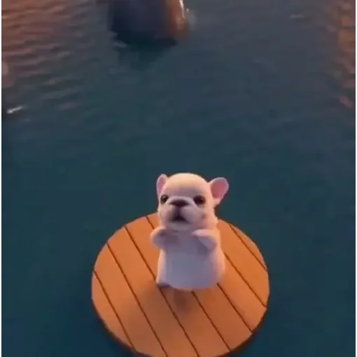 Um cachorro francês branco está em pé em uma plataforma de madeira redonda no meio da água, com as patas dianteiras levantadas.