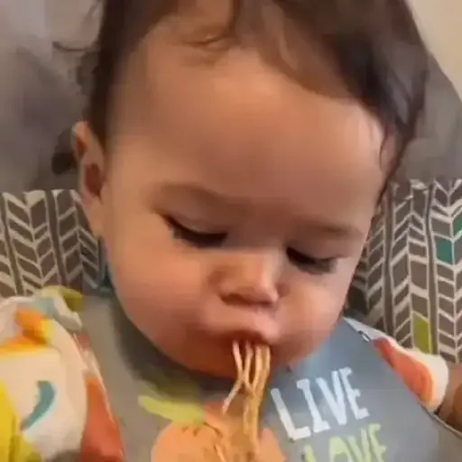 Um bebê com o dedo na boca, parecendo pensativo ou sonolento, com uma roupa cinza e um brinquedo de corda laranja.