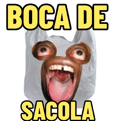 Rosto de macaco com boca aberta e olhos arregalados, sobreposto em sacola plástica, com texto 'BOCA DE SACOLA' em letras amarelas.