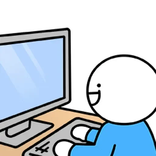 Um personagem de desenho animado com um sorriso está sentado em frente a um computador com a mão no mouse.