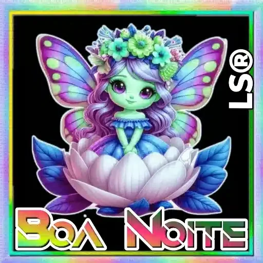 Uma fada com asas de borboleta e uma coroa de flores, sentada em uma flor, com o texto 'Boa Noite' em cores arco-íris.