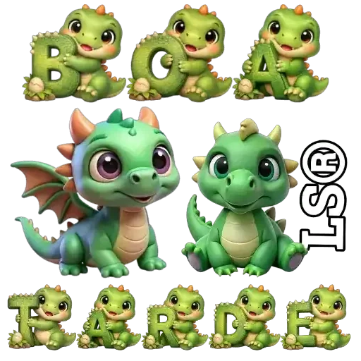 Um conjunto de dragões fofos verdes com olhos grandes e expressões alegres, formando a frase 'Bom Fafe' com alguns deles sentados e outros formando as letras.