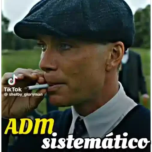 Um homem com um cigarro na boca, vestindo um chapéu e um uniforme, com o texto 'ADM sistemático' na parte inferior. Fundo de gramado e árvores.